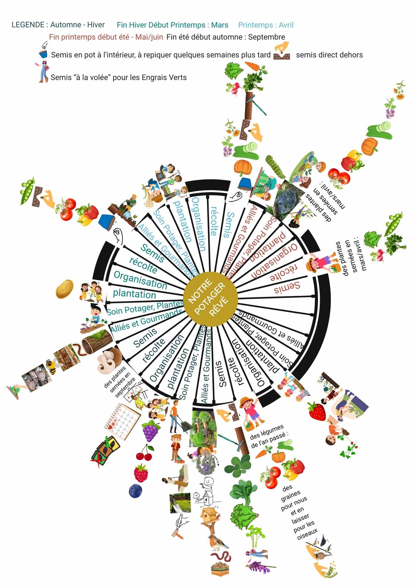 –> Les enfants se répartissent en sous groupe par « saison au potager ». Avec le photolangage du potager (et un calendrier des semis, plantations et récoltes ou des infos derrières les images), ils répartissent les images de leur saison sur un cercle et ils les classent par catégorie :